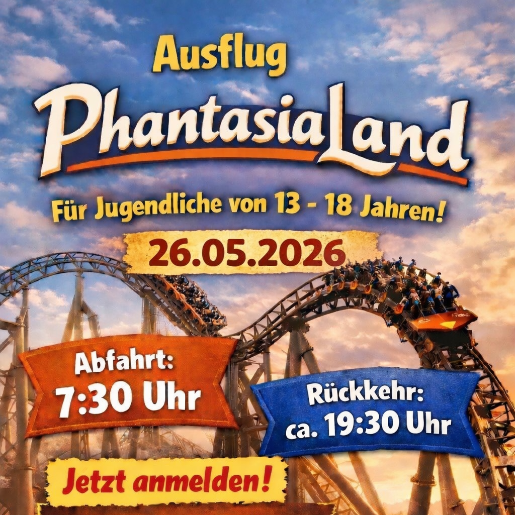 Die offene Kinder- und Jugendarbeit der Stadt Gummersbach bietet allen Kindern und Jugendlichen zwischen 13 und 18 Jahren die Möglichkeit, am Pfingstdienstag, den 26. Mai 2026, eine Tagesfahrt in das Phantasialand Brühl zu unternehmen.